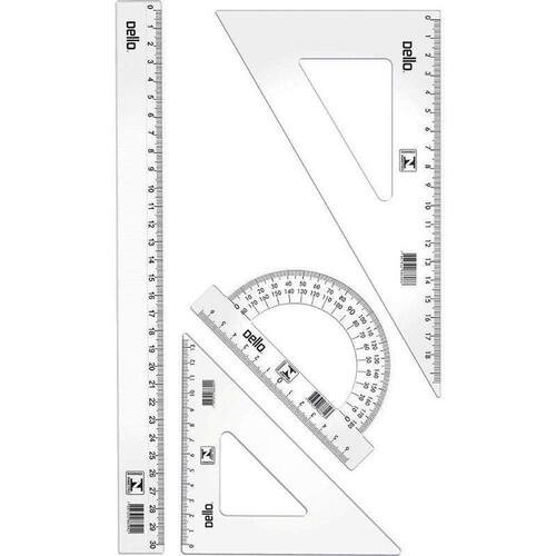 Principais características: - Conjunto para desenho 1 grau - 5 peças de alta qualidade - Produzido em polipropileno resistente - Régua de 30cm para linhas retas - Transferidor de 180º para medir ângulos - Esquadro de 45º e 60º para formas geométricas - Embalagem unitária - Referência: 8730.H.0200