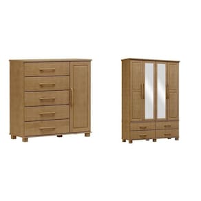 Este conjunto é composto por dois móveis belíssimos da Linha Ouro, produzidos 100% em madeira maciça de pinus, o acabamento é em verniz PU/UV na cor Freijó. O guarda roupa oferece amplo espaço interno, com gavetas equipadas com corrediças telescópicas e portas com sistema de amortecimento, além de espelho aplicado para maior praticidade. Já a cômoda complementa o conjunto com design clássico, puxadores em madeira e compartimentos bem distribuídos para organização eficiente. Possui Portas: Sim Suporta Até (kg): 30 kg Possui Rodízio: Não Altura do Conjunto: 220 cm Ambiente: null Ambiente Principal: Quarto Cor: Freijó Informação Complementar: 1x Cômoda 5 Gavetas 1 Porta 100% Madeira Maciça Linha Ouro Freijó Largura: 125 cm Altura: 124 cm Peso: 47,2 kg Profundidade: 49 cm Necessita Montagem: Sim