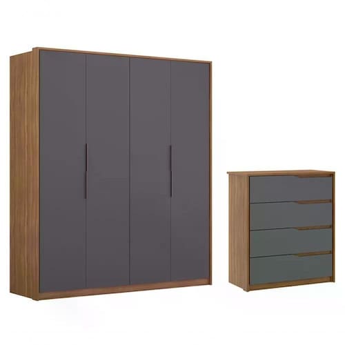 Conjunto Guarda Roupa Com Cômoda, une design e funcionalidade para deixar seu dormitório ainda mais elegante e moderno, possui estrutura em MDP de 12mm e 15mm, acabamento em pintura UV. Roupeiro equipado com 04 portas articulaveis com dobradiças metálicas, conta com 03 gavetas internas com corrediças telescópicas que garantem um fechamento super suave, puxadores das gavetas com detalhe usinado, divisórias internas com muito espaço para seus pertences, maleiros espaçoso, cabideiros em alumínio, sendo um com espaço para roupas longas, nicho inferior ideal para sapatos, puxadores com design sofisticado e discretos em alumínio na cor bronze, a Cômoda possui 04 gavetas com corrediças telescópicas que favorecem o manuseio e proporciona um fechamento leve e perfeito, puxadores em angulo cavados garante praticidade além de muito estilo, o visual moderno deste conjunto oferece sofisticação e bom gosto para a decoração do seu espaço. Estes móveis chegarão em sua casa separados em 06 volumes.