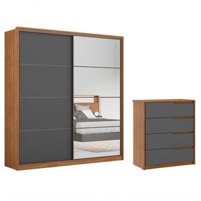 Conjunto Guarda Roupa Com Cômoda, imponente veio pra trazer beleza e grande capacidade de acomodação e organização para roupas e pertences, possui estrutura em MDP de 12mm e 15mm, acabamento em pintura UV (Fosco). Roupeiro equipado com 02 portas de correr com trilhos superior e inferior em alumínio, com movimentos de abre e fecha suave e com muito mais durabilidade, conta com espelhos em uma porta trazendo um visual mais sofisticado, sistema de cores flex, você tem duas opções de cores para escolher na hora da , conta com 03 gavetas internas com corrediças telescópicas que garantem um fechamento super leve e suave, puxadores moderno em alumínio com acabamento na cor bronze, divisórias internas estilo colméia com muito espaço para seus pertences, maleiros espaçoso, cabideiros e calceiros em aluminio com espaço para roupas longas, nichos inferiores ideiais para sapatos, a Cômoda possui 04 gavetas com corrediças telescópicas que favorecem o manuseio e proporciona um fechamento leve e perfeito, puxadores em angulo cavados garante praticidade além de muito estilo, o visual moderno deste conjunto oferece sofisticação e bom gosto para a decoração do seu espaço. Estes móveis chegarão em sua casa separados em 06 volumes.
