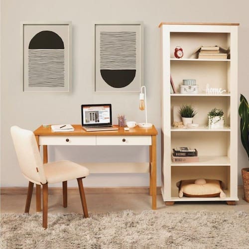 A linha Ananda é uma linha de escritório no estilo clássico, com priorização de funcionalidade e a possibilidade do cliente em montar um ambiente de trabalho com estilo e elegância. Conta com Escrivaninha 120cm 2 Gavetas com corrediças telescópicas e 1 Estante Alta para Livros com 4 prateleiras. Altura do Conjunto: 178.2 cm Ambiente: null Ambiente Principal: Escritório Cor: Off White/Mel Informação Complementar: 1x Escrivaninha 120cm 2 Gavetas Tampo Pés em Madeira Maciça Ananda Off-white/Mel Largura: 120 cm Altura: 77,3 cm Peso: 23 kg Profundidade: 50 cm Necessita Montagem: Sim