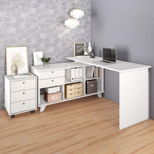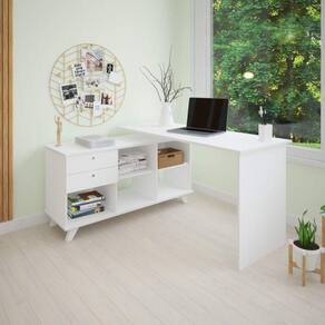 Trabalhe e estude de maneira organizada e produtiva com a Escrivaninha Gold, perfeita para você transformar o ambiente em um local agradável e charmoso. Os nichos e as gavetas são ideais para manter o local organizado, já que guardam todos os seus objetos, livros e materiais com elegância. Perfeito para organizar e decorar, o Gaveteiro Day encanta à primeira vista com seu gracioso desenho, destacado pelos delicados pezinhos no estilo retrô e simpáticos puxadores embutidos. Acabamento: BP Altura do Conjunto: 75 cm Ambiente: null Ambiente Principal: Escritório Cor: Branco Informação Complementar: 1x Gaveteiro 3 Gavetas New BrancoLargura: 40 cmAltura: 49 cmPeso: 15 kgProfundidade: 40 cmNecessita Montagem: Sim1x Escrivaninha em L Retrô para Escritório Gold BrancoAltura: 75 cmPeso: 49 kgProfundidade: 60 cmNecessita Montagem: Sim Material Principal: MDP Possui Portas: Não Tamanho: