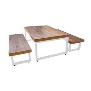 Características Tipo: Conjunto mesa com bancos Modelo: Bernardo Cor: Madeira maciça Cor base: Branco