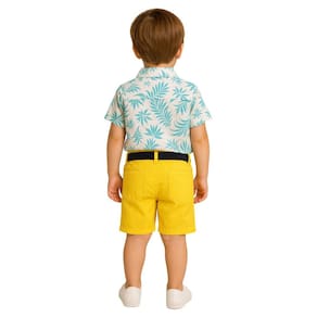 Conjunto Infantil Camisa Floral e Bermuda Azul Amarelo Social é ideal para ocasiões especiais e dias quentes. A camisa de manga curta tem estampa floral tropical em azul e branco, com botões frontais, perfeita para eventos formais com toque leve. A bermuda Amarelo e azul social acompanha cinto embutido, oferecendo um visual elegante e confortável.