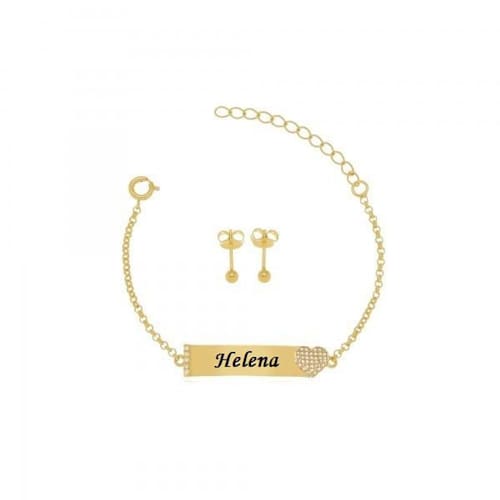 Conjunto Infantil Chapinha Coração e Brinco Bolinha Banho de OuroTamanho da Pulseira Padrão:12cmTamanho do Plaquinha: -Altura 0,6mm -Comprimento 3,2mm -Espessura 0,1mmPeso: 4,36gg- Acompanha Embalagem para presentear- Acompanha certificado de garantia-temos uma equipe preparada para te auxiliar no pós vendaJhulias Joias e Semi JoiasQualidade e Garantia
