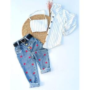 Conjunto feminino infantil moda blogueirinha, super estiloso. Camisa listrada risco de gis com elástico no punho e fechamento em botões, cropped com alças trasversal. As peças também podem ser usadas separadamente.