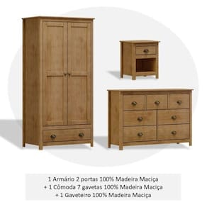 O conjunto é fabricado 100% em madeira maciça de pinus com acabamento em verniz PU/UV acetinado na cor Freijó. O guarda-roupa oferece organização para roupas e acessórios, a cômoda amplia o armazenamento com sete gavetas espaçosas, e a mesa de cabeceira complementa o ambiente com funcionalidade para o dia a dia. Um conjunto que une durabilidade, beleza natural da madeira e praticidade, ideal para deixar o quarto infantil mais organizado, charmoso e aconchegante. Possui Rodízio: Não Altura do Conjunto: 185.5 cm Ambiente: null Ambiente Principal: Quarto Infantil Cor: Freijó Informação Complementar: 1x Cômoda para Quarto 7 Gavetas Topázio 100% Madeira Maciça Freijó Largura: 125 cm Altura: 85 cm Peso: 36,3 kg Profundidade: 41 cm Necessita Montagem: Sim
