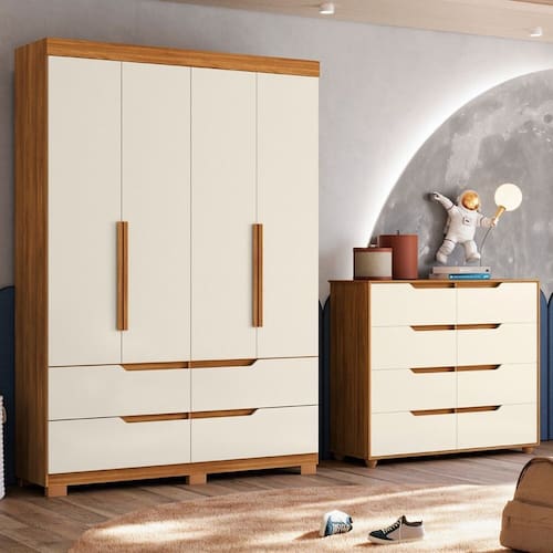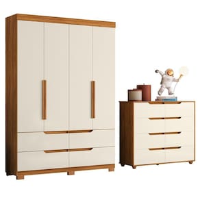 Quarto Infantil Completo Circus: composto por guarda-roupa com 04 portas, 04 gavetas com corrediças telescópicas, cabideiro em alumínio e puxadores em MDF revestidos. Acompanha cômoda com 08 gavetas, também com corrediças telescópicas e puxadores cava, que dispensam o uso de puxadores externos. Funcionalidade, charme e praticidade para o quartinho dos sonhos! Altura do Conjunto: 230 cm Ambiente Principal: Quarto Infantil codigo_ean: 7900288199270 Complexidade da Montagem: Alta: deve ser montado por um montador especializado Cor: Cinamomo / Off White Cor do Produto: Cinamomo / Off White Escala de Brilho: Fosco Informações Complementares: Cômoda Suporta 40 Kg - Vistas da Cômoda Flex Largura do Conjunto: 296 cm Linha ou Coleção: Circus Manual de Especificação Técnica: https://cdn2.madeiramadeira.com.br/atributo/albatroz-moveis/3088525-675-17532017264039.pdf Manual de Montagem e Instalação: https://cdn2.madeiramadeira.com.br/atributo/albatroz-moveis/3088812-675-17532098973043.pdf Marca: Albatroz Móveis Material Principal: MDP Medida de Cada Item: 2,30 A X 1,60 L X 0,47 P M (GUARDA ROUPA) 1,16 A X 1,36 L X 0,45 P M (CÔMODA) modular: Não Necessita Montagem: Sim O Conjunto Contém: Cômoda/Guarda-Roupa Origem do Produto: Nacional Peso: 163.35 Porta Janelada: Não Possui Portas: Sim Quantidade de Portas: 04 Recomendações de Uso, Manutenção e Limpeza: Limpar com flanela ou pano macio seco, não utilizar produtos abrasivos, desengordurantes, álcool ou solvente. Não expor o produto diretamente á luz solar e á umidade. Sistema de Montagem: Parafusos, cavilhas e minifix Suporta Até (kg): 67