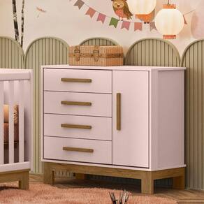 A cômoda é feita em MDP 15mm, possuindo quatro gavetas com corrediças metálicas e uma porta com amplo espaço para organizar sapatos e roupas.
