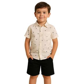 Garanta estilo e conforto para o seu pequeno com este conjunto infantil masculino composto por camisa bege clara com estampa minimalista e shorts preto. A camisa de manga curta é confeccionada em tecido leve e macio, com fechamento por botões frontais e caimento confortável, ideal para dias quentes. O shorts preto em tecido resistente possui cós com elástico para melhor ajuste e liberdade de movimento, perfeito para passeios, eventos ou uso diário. Um look versátil e moderno para qualquer ocasião.