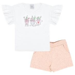 Meninas charmosas e fashionistas amam lookinhos Pulla Bulla! Composto por uma blusa meia malha na cor branca com estampa de flores com strass e escrita "vida são flores" e short em moletom linho na cor rosa pó com bolsos laterais funcionais e elastano na cintura para maior conforto ao usar a peça! Versátil para todas as ocasiões do dia a dia.