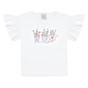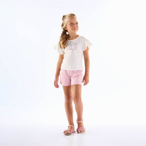 Meninas charmosas e fashionistas amam lookinhos Pulla Bulla! Composto por uma blusa meia malha na cor branca com estampa de flores com strass e escrita "vida são flores" e short em moletom linho na cor rosa pó com bolsos laterais funcionais e elastano na cintura para maior conforto ao usar a peça! Versátil para todas as ocasiões do dia a dia.