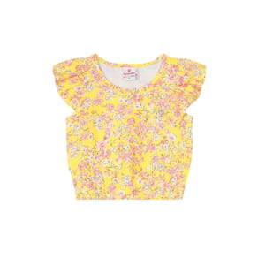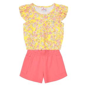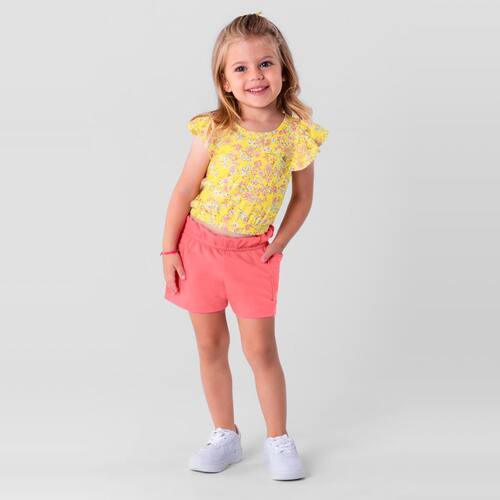 Perfeito para os momentos de diversão e fantasia, conjunto infantil menina composto por blusa e shorts. A blusa confeccionada em malha, de modelagem cropped possui mangas curtas com babados, decote redondo e estampa rotativa, já o shorts possui cor lisa, elástico no cós e bolsos laterais. Invista!