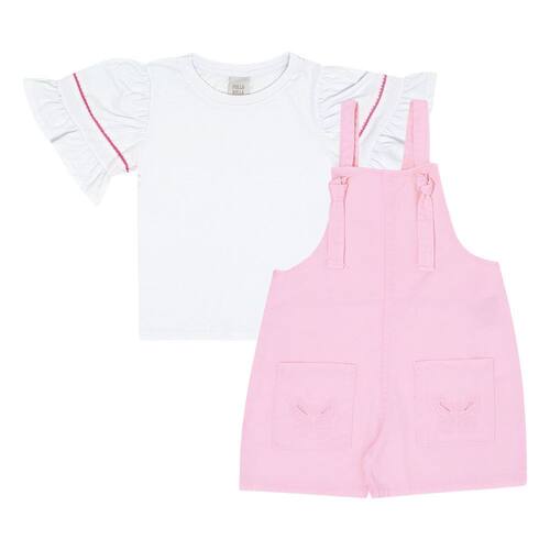 Versátil, estiloso e charmoso para as fashionistas de plantão! Conjunto jardineira composto por uma jardineira em sarja na cor chiclete com bolsos frontais, fechamento da peça em amaração nas alças acompanha blusa meia malha na cor branca. Um charme!