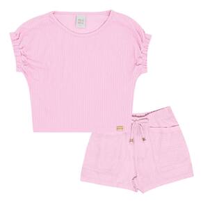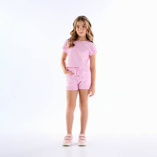 Básico e versátil para usar o conjunto ou criar novas composições para o dia a dia! Conjunto composto por blusa e short na cor chiclete em malha corrente. Short possuí bolsos frontais funcionais, elastano na cintura para maior conforto e amarração em laço com ponteiras de metal.