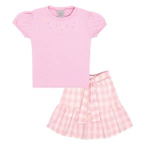 Delicadeza e estilo para explorar os dias quentes da estação! Composto por blusa malha canelada na cor chiclete lumi e com gola arredondada, manga curta e bordado frotal de pérolas. Já a saia short em tecido cotton leve e xadrez fio tinto na cor chiclete possuí detalhe frontal de amaração em laço. Um verdadeiro charme!