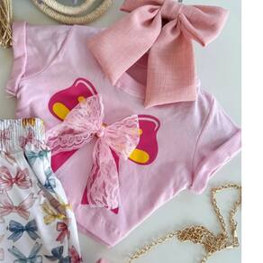 Lindo conjunto infantil moda blogueirinha. Um look perfeito para arrasar nas estações outono inverno e também verão. Conjunto composto por cropped 100% algodão, com laço 3D na frente, que pode ser retirado na hora da lavagem para preservar a peça e a calça jogger com elástico na cintura com uma estampa linda de lacinhos combinado com o cropped.