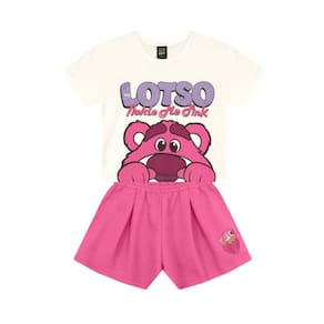 Se a sua pequena ama personagens divertidos, ela vai se encantar com esse conjunto inspirado no Lotso, o ursinho mais carismático de todos! A blusa é feita em meia malha bem confortável e traz uma estampa em gel com glitter do Lotso, cheia de brilho e fofura, com mangas curtas e gola redonda. O shorts em moletinho com cós elástico completa o look com um aplique superfofo do personagem, perfeito para deixar o visual ainda mais divertido. Um conjunto tão estiloso e cheio de charme quanto o Lotso, perfeito para o dia a dia da sua menina!