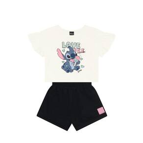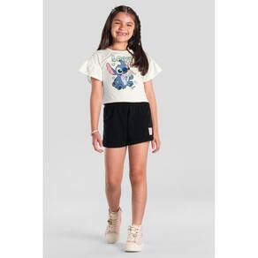 Um conjunto feito para as pequenas exploradoras interestelares! A blusa cropped em meia malha traz uma estampa localizada do Stitch com aplique em strass, manga curta e gola redonda, que garantem conforto para correr, pular e se divertir muito. O shorts em moletinho, macio e confortável, possui cós elástico e vem com um aplique termocolante do Stitch que dá aquele toque final cheio de charme e personalidade. Um look completo para meninas que adoram se divertir com estilo e um toque de magia do universo do nosso alienígena favorito!
