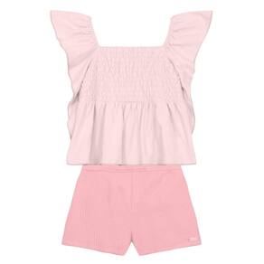 Deixe sua pequena deslumbrante com o conjunto infantil da Mundi! Composto por uma blusa em meia malha, apresenta delicados babados nas mangas e na barra, além de um elegante decote quadrado. O shorts, confeccionado em moletinho quadrile com cós elástico, garante conforto e liberdade de movimento. Ideal para dias de diversão e brincadeiras, esse look é perfeito para compor produções cheias de estilo. Invista na moda infantil com qualidade e charme!