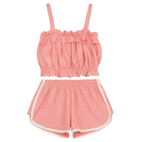 Deixe sua pequena ainda mais estilosa com o conjunto infantil da Brandili. Confeccionado em malha anarruga fio tinto, o tecido leve e texturizado traz um caimento suave e cores vibrantes. A blusa cropped com alças de regata e babados frontais adiciona um toque de charme, enquanto o shorts com cós elástico garante conforto para o dia a dia. Uma escolha perfeita para quem busca estilo e praticidade em uma única peça.