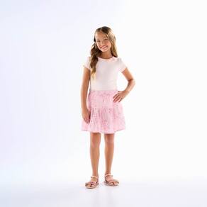 Conjunto ideal para curtir momento especiais durante o verão! Composto por blusa em tecido cotton leve na cor off white com gola arredondada, manga curta e aplique de flor frontal próxima a gola. Já a sai short possuí estampa sublimada na cor pink e elástico na cintura para maior conforto.