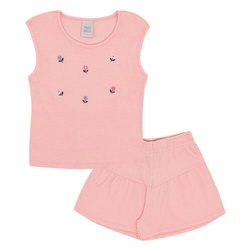 O dia de calor pede um look charmoso e fresquinho para curtir um passeio com a vovó! Conjunto composto por blusa e short meia malha na cor rosê. A blusa possuí estampa bordada de flores com strass e o short possuí elastano na cintura para maior conforto e movimentação.