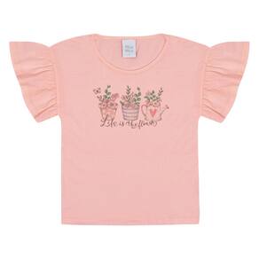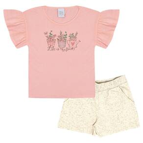 Meninas charmosas e fashionistas amam lookinhos Pulla Bulla! Composto por uma blusa meia malha na cor rosê com estampa de flores com strass e escrita "vida são flores" e short em moletom linho na cor natural com bolsos laterais funcionais e elastano na cintura para maior conforto ao usar a peça! Versátil para todas as ocasiões do dia a dia.
