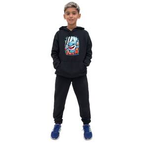 Conjunto Infantil Menino Blusa Manga Longa Estampa de Tubarao e Calça Lisa Moletom Confortavel - Preto - 10