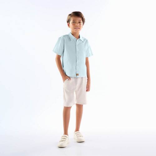Conjunto ideal para uma festa, passei ou momento especial que pede por um look arrumadinho. Composto por camisa tricoline na cor céu e abertura frontal com botões. Já a bermuda em tecido eco na cor cáqui possuí bolsos funcionais e cinto.