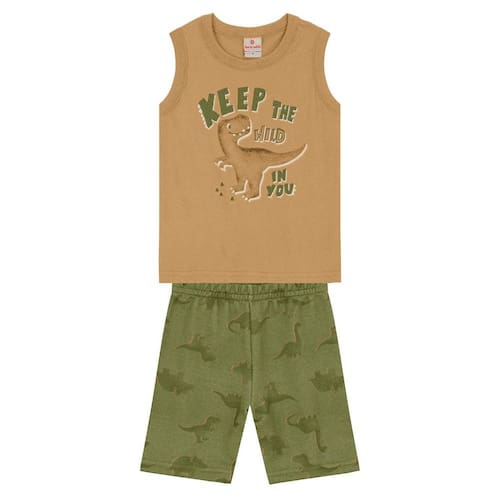 Transforme o visual do seu pequeno com o incrível conjunto infantil masculino da Brandili! Composto por uma regata em meia malha, apresenta uma divertida estampa em puff de dinossauro que vai encantar os meninos. A bermuda em moletinho, com estampa similar e cós elástico, garante conforto e liberdade de movimento. Ideal para os dias quentes, esse look versátil é perfeito para brincadeiras e passeios. Aposte nesse conjunto e veja seu bebê arrasar com estilo e diversão!