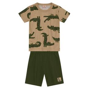 Deixe seu bebê ainda mais estiloso com o encantador conjunto infantil da Brandili! Composto por uma camiseta em meia malha, apresenta uma divertida estampa de jacaré, perfeita para os pequenos aventureiros. A bermuda em moletinho, de cor lisa, traz um detalhe de aplique termocolante que complementa o visual. Ideal para dias quentes, esse conjunto garante conforto e liberdade de movimento. Combine com tênis e um boné para um look despojado e cheio de charme!