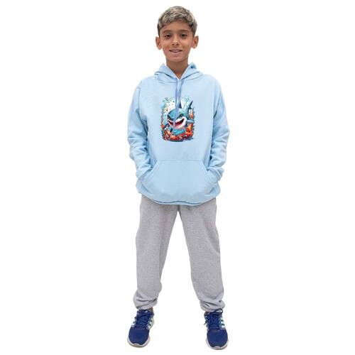 Conjunto Infantil Menino Estampa Tubarao Blusa Canguru e Calça Moletom Toque Macio - Azul Claro - 10