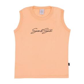 Brincar e estar confortável é mais divertido com looks Pulla Bulla! Conjunto composto por uma regata na cor pêssego com gola reforçada e estampa frontal gel relevo escrita "mar e sol - brincando por toda parte" e bermuda moletom na cor carbono com estampado tropical