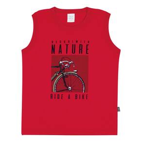 Conjunto versátil e confortável para os meninos curtirem o dia a dia! Composto por uma regata meia malha na cor vermelha, possuí gola redonda e reforçada com estampa de bicicleta e escrita "seja legal com a natureza, ande de bicicleta. Já a bermuda em moletom liso na cor marinho complementa o look.