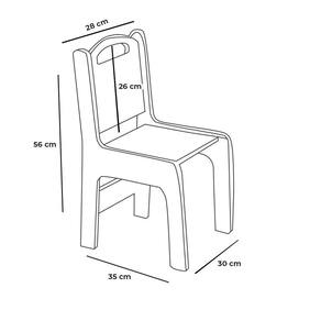 Cadeira Infantil Medidas Aproximadas: Altura total: 56 cm Largura do assento: 28 cm Profundidade: 30 cm Altura do encosto: 26 cm Comprimento da base: 35 cm