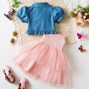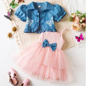 Encante-se com a delicadeza deste conjunto infantil composto por vestido rosa em tule com laço azul e casaquinho jeans leve com estampa de borboletas. Um look encantador para ocasiões especiais, festas ou passeios, garantindo estilo e conforto para sua pequena.