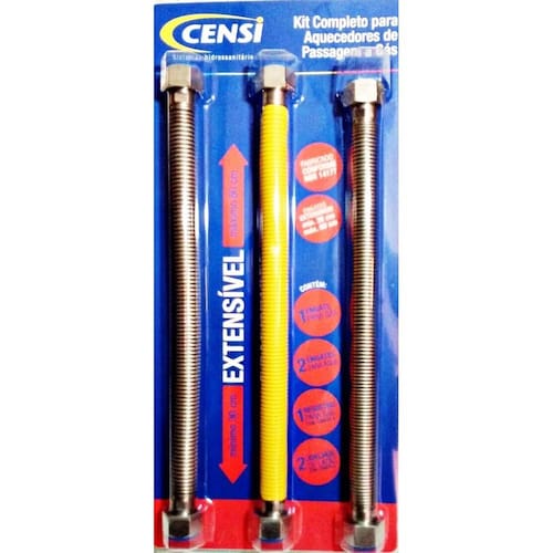 O kit de engates extensíveis para aquecedores de passagem a gás é fabricado em aço inox, sendo o de gás revestido com material antichama. É amplamente utilizado para ligação de água e gás em aquecedores de passagem, mas pode ser aplicado em outros pontos de ligação de água ou gás. Especificações fabricante: censi referência: 7560 engate extensível para gás: engates de aço inox com porcas de latão revestido com termoplástico antichama para gás rosca fêmea x fêmea 1/2 x 1/2 temperatura máxima: 160 c pressão máxima: 15 bar diâmetro interno: 12,5 mm comprimento: mínimo 30 cm / máximo 60 cm acompanha vedantes engates extensíveis para água: engates de aço inox com porcas de latão rosca fêmea x fêmea 1/2'' x 1/2'' temperatura máxima: 100 c pressão máxima: 15 bar diâmetro interno: 12,5 mm comprimento: mínimo 30 cm / máximo 60 cm acompanha vedantes registro: registro de latão com acabamento niquelado 1/2'' x 1/2'' macho x macho canopla de aço inox mecanismo de fechamento 1/4 de volta joelho: joelho de latão com acabamento cromado 1/2 '' x 1/2'' macho x macho canopla em aço inox multi uso: aquecedores a gás, duchas higiênicas, etc. Garantia: 1 ano a garantia não cobre peças com arranhões ou riscos provenientes do mau uso de ferramentas ou esponjas abrasivas.