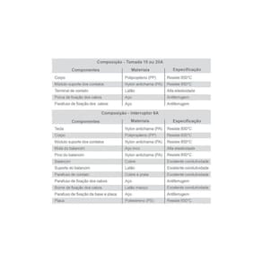 Ficha técnica: Tensão: 250V Amperagem: 10A ou 20A Certificação compulsória: Sim Normas: NBR NM 60884-1 e NBR 60669-1