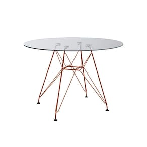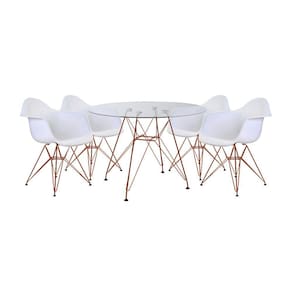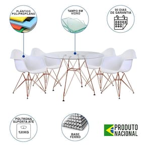 Conjunto Jantar Mesa Redonda Vidro Eames Eiffel 90cm Com 4 Poltronas Brancas Ferro CobreO Conjunto de Mesa Eames Eiffel e Poltrona Daw se destaca pelo design moderno e sofisticado. Com base em ferro que confere total resistência, garantindo melhor durabilidade, sendo uma ótima escolha para quem busca conforto e design único.Tipo: ConjuntoModelo: DawCor do Tampo: VidroCor do Assento: BrancoCARACTERÍSTICASAssento: PolipropilenoTampo: VidroBase: FerroGarantia: 90 DiasDIMENSÕES DA POLTRONAAltura: 80cmAssento até o chão: 40cmBraço do assento até o chão: 65cmLargura: 38cmComprimento: 38cmSuporta até: 120kgDIMENSÕES DA MESAAltura: 76cmDiâmetro: 90cmRECOMENDAÇÕESLimpeza: Utilize um pano macio levemente úmido.Necessita montagem.ATENÇÃOAS IMAGENS SÃO MERAMENTE ILUSTRATIVAS E PODEM SOFRER VARIAÇÕES DE COR E PEQUENOS DETALHES DE ACORDO COM O SEU MONITOR, ILUMINAÇÃO DO AMBIENTE E ATÉ MESMO A SUA PERCEPÇÃO VISUAL.