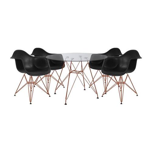 Conjunto Jantar Mesa Redonda Vidro Eames Eiffel 90cm Com 4 Poltronas Pretas Ferro Cobre O Conjunto de Mesa Eames Eiffel e Poltrona Daw se destaca pelo design moderno e sofisticado. Com base em ferro que confere total resistência, garantindo melhor durabilidade, sendo uma ótima escolha para quem busca conforto e design único.Tipo: ConjuntoModelo: DawCor do Tampo: VidroCor do Assento: PretoCARACTERÍSTICASAssento: PolipropilenoTampo: VidroBase: FerroGarantia: 90 DiasDIMENSÕES DA POLTRONAAltura: 80cmAssento até o chão: 40cmBraço do assento até o chão: 65cmLargura: 38cmComprimento: 38cmSuporta até: 120kgDIMENSÕES DA MESAAltura: 76cmDiâmetro: 90cmRECOMENDAÇÕESLimpeza: Utilize um pano macio levemente úmido.Necessita montagem.ATENÇÃOAS IMAGENS SÃO MERAMENTE ILUSTRATIVAS E PODEM SOFRER VARIAÇÕES DE COR E PEQUENOS DETALHES DE ACORDO COM O SEU MONITOR, ILUMINAÇÃO DO AMBIENTE E ATÉ MESMO A SUA PERCEPÇÃO VISUAL.