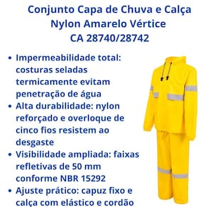 - Impermeabilidade total: costuras seladas termicamente evitam a penetração de água. - Alta durabilidade: nylon reforçado e overloque de cinco fios resistem ao desgaste. - Visibilidade ampliada: faixas refletivas de 50 mm conforme a NBR 15292. - Ajuste prático: capuz fixo e calça com elástico e cordão.