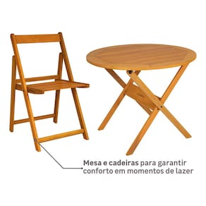Projetado para ambientes externos, o conjunto e fabricado em madeira resistente, garantindo longa vida util e um toque natural ao seu jardim, varanda ou quintal. O design funcional da mesa dobravel facilita o armazenamento e o transporte, tornando-o perfeito para quem valoriza solucoes inteligentes para o lar. As cadeiras, com acabamento que complementa a mesa, oferecem assentos confortaveis para momentos de lazer e confraternizacao ao ar livre.