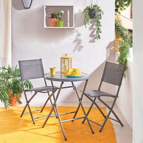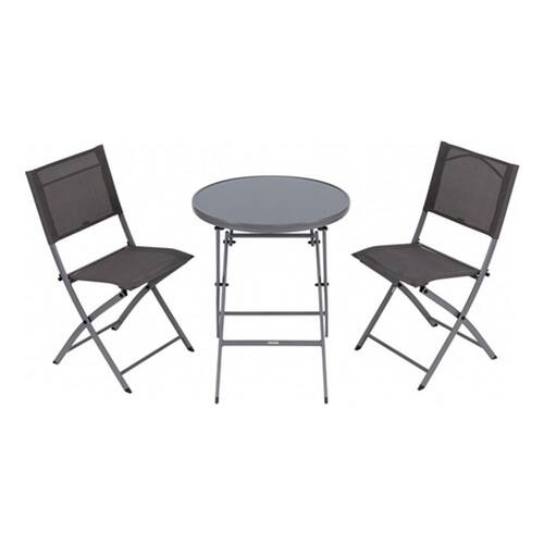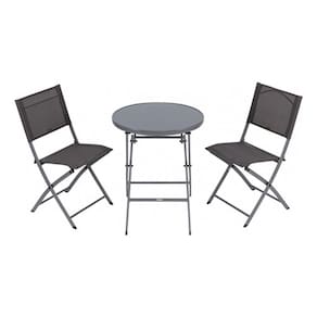 Este conjunto de moveis para jardim e ideal para quem busca conforto e praticidade em areas externas cobertas. Composto por uma mesa redonda e duas cadeiras dobraveis, o conjunto e fabricado em aco de alta qualidade na cor cinza escuro, oferecendo durabilidade e resistencia. O tampo da mesa e feito de vidro temperado, agregando um toque de elegancia e facilidade na limpeza.
