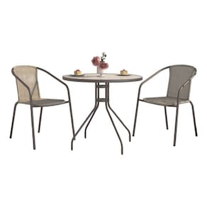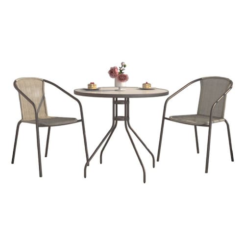 Este conjunto de moveis para jardim e ideal para quem deseja combinar funcionalidade e estilo em espacos externos cobertos. Composto por uma mesa redonda e duas cadeiras, o conjunto e fabricado em aco resistente e apresenta um acabamento na cor bege que adiciona um toque de elegancia ao ambiente.