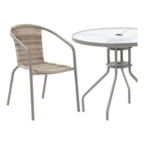 A mesa possui um tampo de vidro e estrutura metalica na tonalidade cinza, medindo 70x80x80 cm, oferecendo durabilidade e facilidade de limpeza. As cadeiras, com assento e encosto em plastico tipo rattan, proporcionam conforto e resistencia, sendo perfeitas para uso prolongado. Cada cadeira mede 77x59x59 cm.