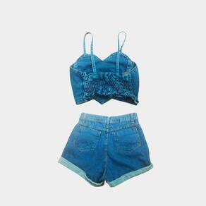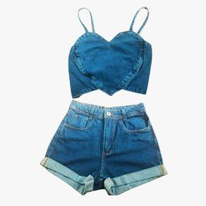 Conjunto jeans feminino short e cropped modelo coração com lastex nas costa