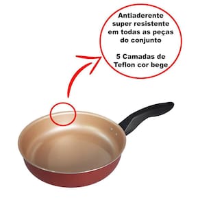 Esse conjunto de panelas com 5 peças cor cereja conta com um teflon antiaderente cor bege, classificado como A ótimo , super resistente e livre de PFOA. Além disso esse conjunto conta com diversos benefícios.