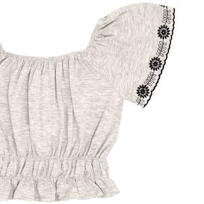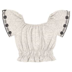 Conjunto composto por blusa e short. A blusa em meia malha na cor mescla banana com elástico na gola e franzido na cintura, mangas com detalhe de bordado diferenciado. Já o short modelo bengaline preto metalizado possuí bolsos funcionais e elástico no cós para maior conforto e movimentação.