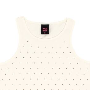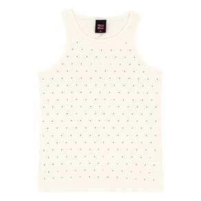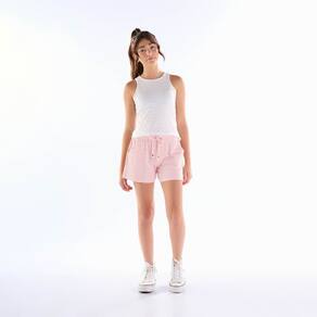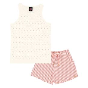 Conjunto ideal para apostar aos dias de calor! Composto por blusa cotton leve modelo regata na cor off white com aplique metalizado frontal e short malha trabalhada fio tinto listrado coral com bolsos funcionais e detalhe decorativo de cordão com ponteira de metal.